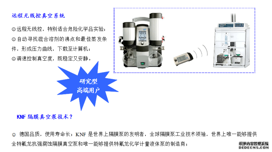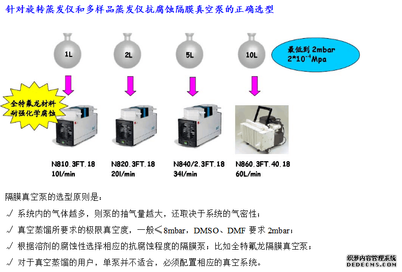 答:旋轉(zhuǎn)蒸發(fā)儀、多樣品蒸發(fā)儀需要配真空泵才能使用,一般以水循環(huán)真空泵和隔膜泵較常見,而油泵較少見。隔膜泵比水循環(huán)真空泵可達(dá)到更高的真空度,因此水循環(huán)真空泵在蒸餾高沸點(diǎn)溶劑時很慢,如有機(jī)實驗室常用的DMSO。KNF全特氟龍隔膜真空泵抗強(qiáng)化學(xué)腐蝕,如HCl、HNO3、HF、甲苯、氯仿等所有化學(xué)物,且能完全回收,不會飄散出去污染環(huán)境和影響健康。在歐盟G家出于對環(huán)境保護(hù)的考慮,已禁止使用水循環(huán)真空泵;而在日本則立法強(qiáng)制要求廢水處理達(dá)標(biāo)后才能排放。因此樣品內(nèi)含有機(jī)溶劑,建議用隔膜泵較好。