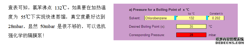 問2、在做滌綸中偶氮分析時,用旋轉(zhuǎn)蒸發(fā)儀蒸發(fā)氯苯、二甲苯溶劑。按方法上說,在45~60℃旋蒸,我設(shè)在55℃,真空度50mbar,蒸不出來是怎么回事?